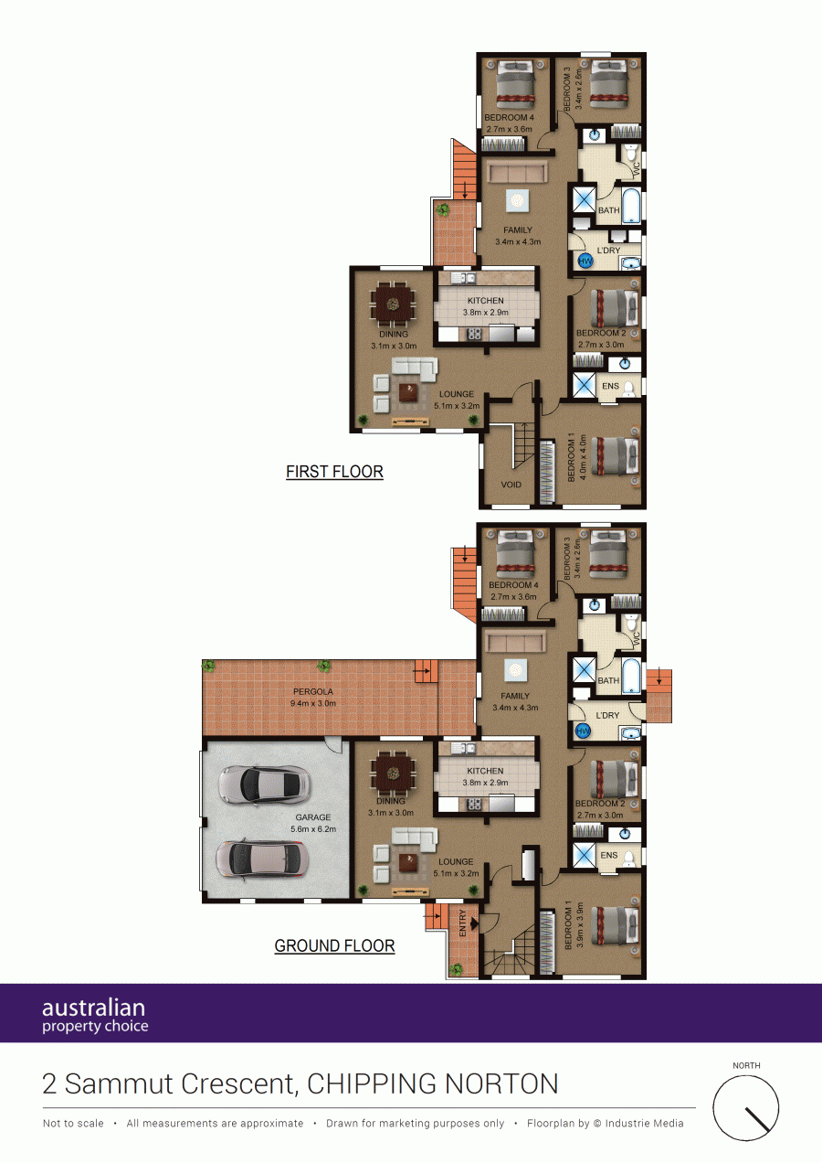 Downstairs is mirrored imaged to the upper lever, with four large bedrooms, two bathrooms, formal lounge and dining room, separate family room with open plan kitchen, an automatic double lock-up garage with extra storage area